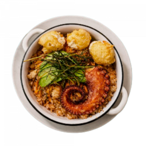 ARROZ CON CAMARÓN, PULPO Y CALLO CATARINA, SALTEADOS CON SOYA. ACOMPAÑADO DE UNAS BOLITAS DE QUESO CREMA.