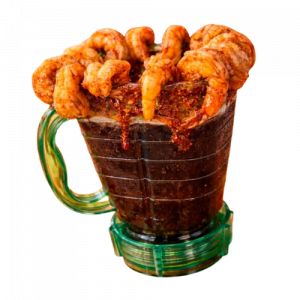 Camarón, pulpo, ostión y pulpa de jaiba bañados en salsa de coctel.