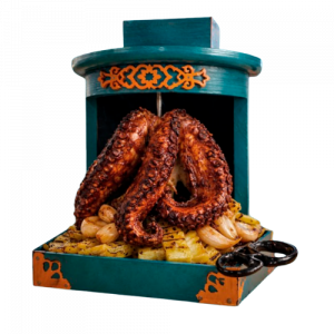 PULPO MONTADO EN TROMPO AL ESTILO PASTOR, BAÑADO EN SU SALSA, CON PIÑA, CEBOLLA REBOZADA, CEBOLLA BLANCA Y CILANTRO.